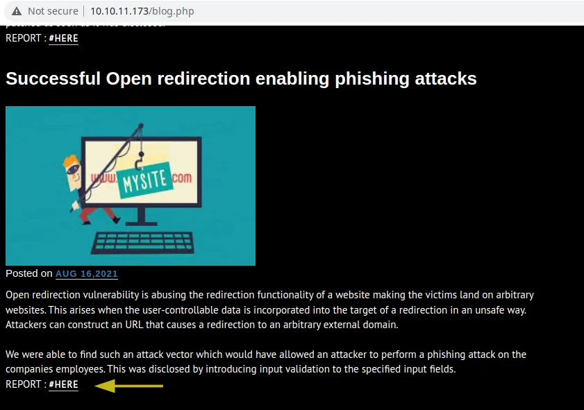 Fire up Burp Suite and browse the web application to look for potential attack vectors. We stumble upon a blog, which contains links to some reports on the /reports.php endpoint.