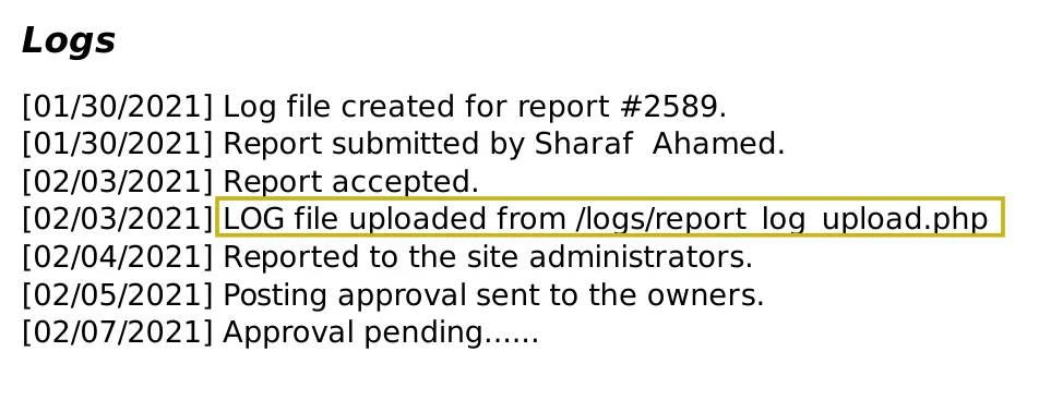 First, check /var/www/html/logs/report_log_upload.php to see the various checks preformed against the uploaded file.