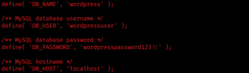 Next, take a look at wp-config.php to get hold of the MySQL credentials: