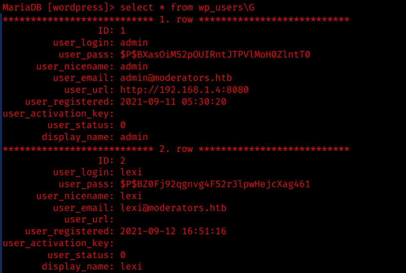 There are some interesting hashes, which can be updated and replaced with our own md5 hash to gain access to wordpress. We won’t update any database information, since it we would not gain anything.