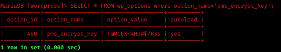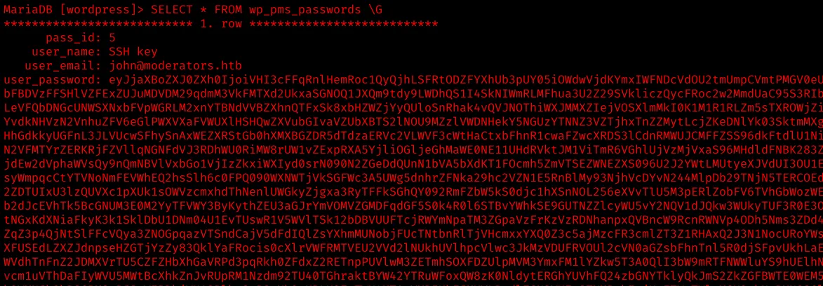 There is another interesting table wp_pms_passwords, which contains the SSH key for the user john: