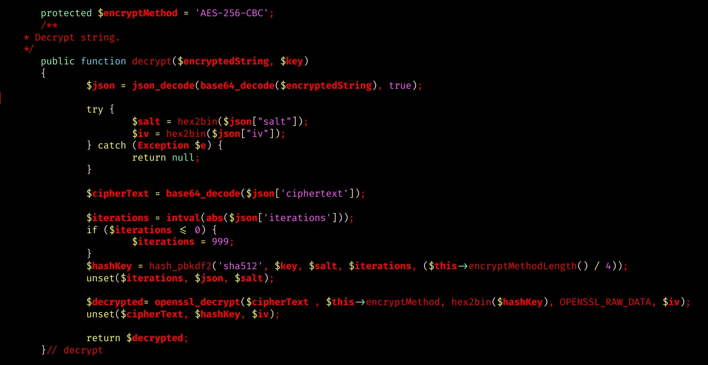 Provide the decrypt function the encrypted string, which contains the ciphertext, the salt and the iv and the encrypt key, we previously dumped from the database.