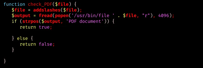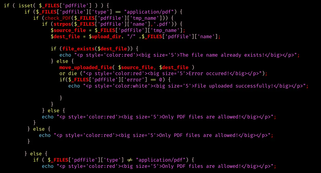 If we try to upload a PHP file without changing the Content-Type, the application will throw an error Only PDF files are allowed!.