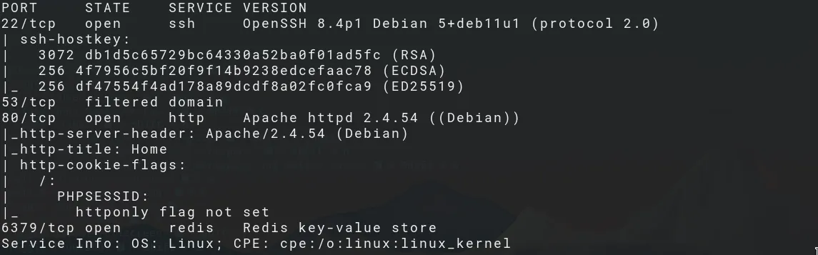 The nmap scan reveals a Debian machine with 3 open ports: