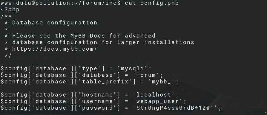 We enumerate a bunch of config files and get the credentials for the MySQL service on port 3306.