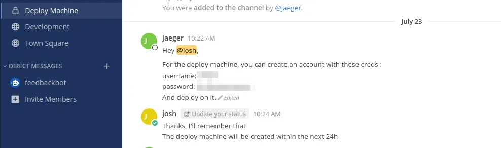 There is a chat history, which reveals sensitive information about the “deploy” user: