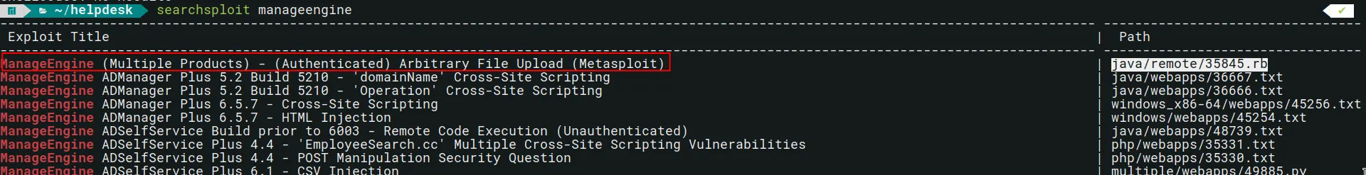 We check searchsploit again and notice that there is a Metasploit module which abuses a Arbitrary File Upload vulnerability as an authenticated user.