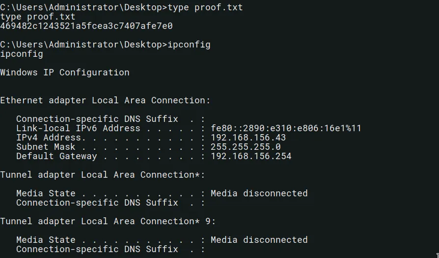C:\Windows\system32>type C:\Users\Administrator\Desktop\proof.txt